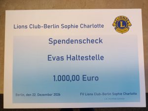 Am 22.12.2025 haben unsere Mitglieder Dorothee Schuler und Claudia Peter den Scheck in Höhe von € 1000.00 aus den Einnahmen vom diesjährigen Weihnachtsmarkt an Frau Kulik von Evas Haltestelle überreicht. Ebenso wurden die Sachspenden, die auf der diesjährigen Weihnachtsfeier des Lions Clubs eingesammelt wurden, übergeben.